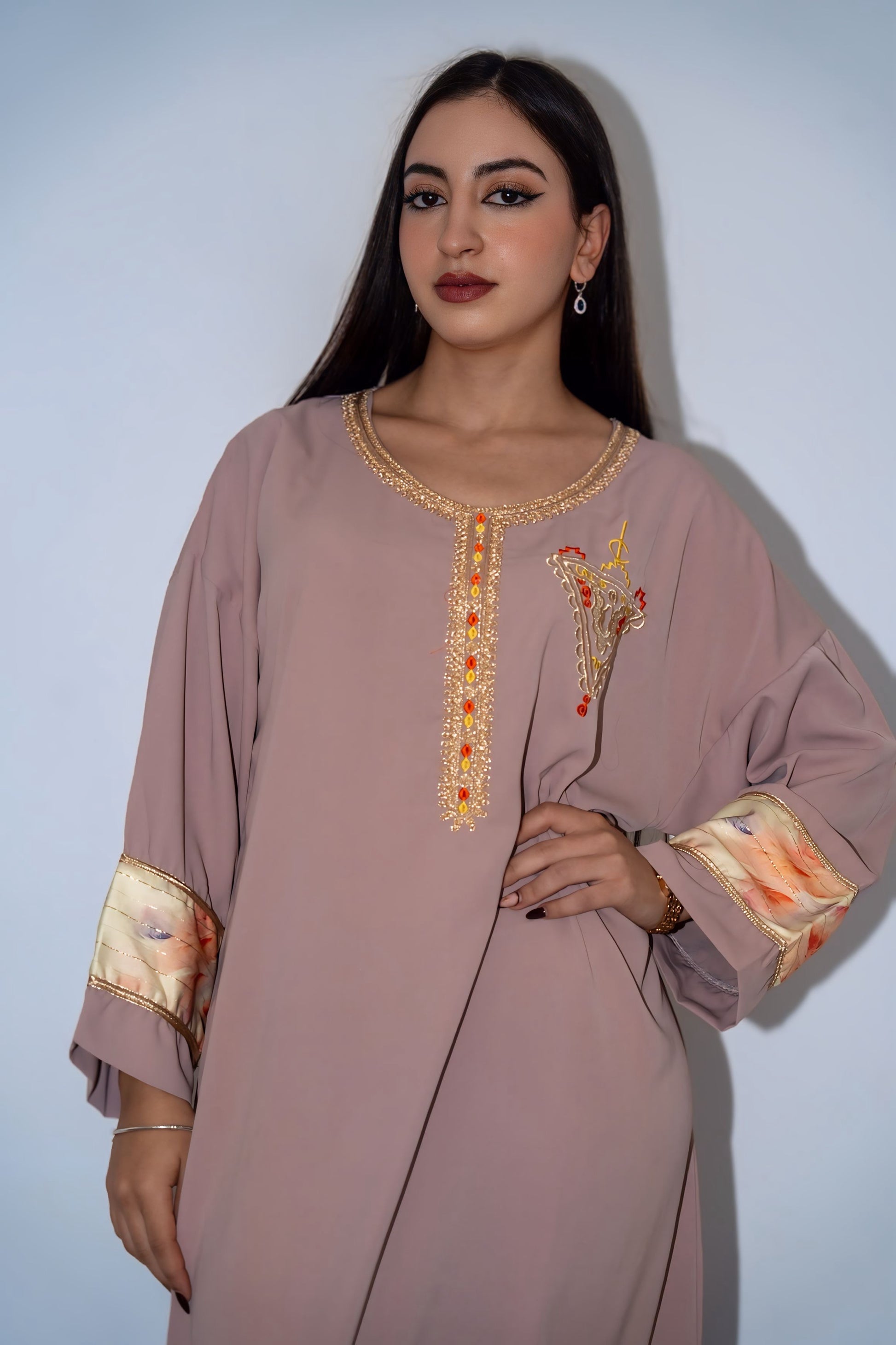 Abaya lunga dal taglio fluido e moderno, realizzata in tessuto leggero color rosa cipria. Il modello presenta maniche ampie e una vestibilità confortevole che dona eleganza naturale alla silhouette. Il décolleté è impreziosito da raffinati ricami decorativi color oro con dettagli a contrasto più caldi, che valorizzano il davanti con un tocco luminoso e sofisticato. I polsini rifiniti con inserti decorativi coordinati completano il design con carattere e armonia. Un’abaya elegante e versatile, ideale per occasioni speciali, eventi formali e momenti di stile quotidiano.