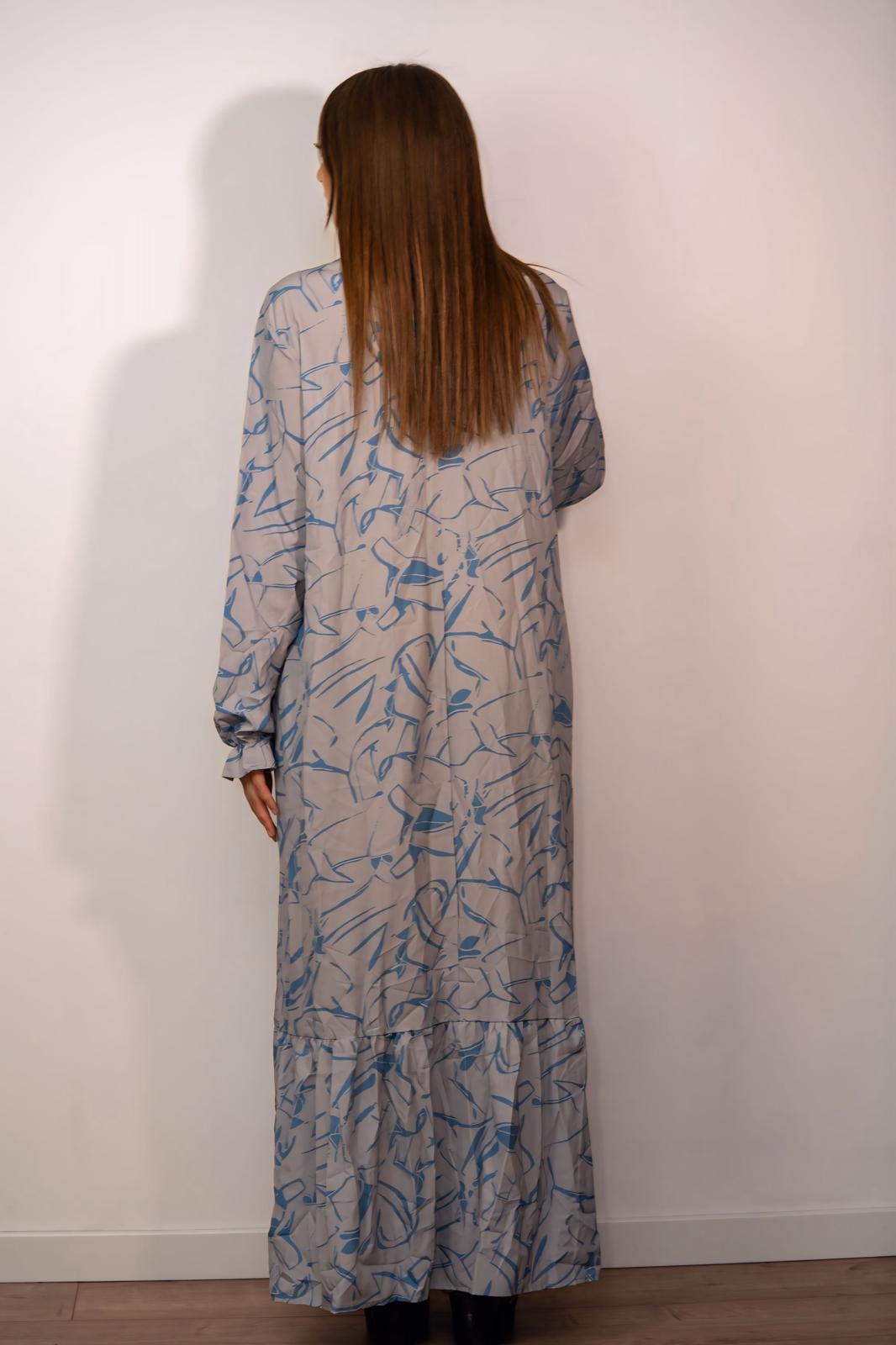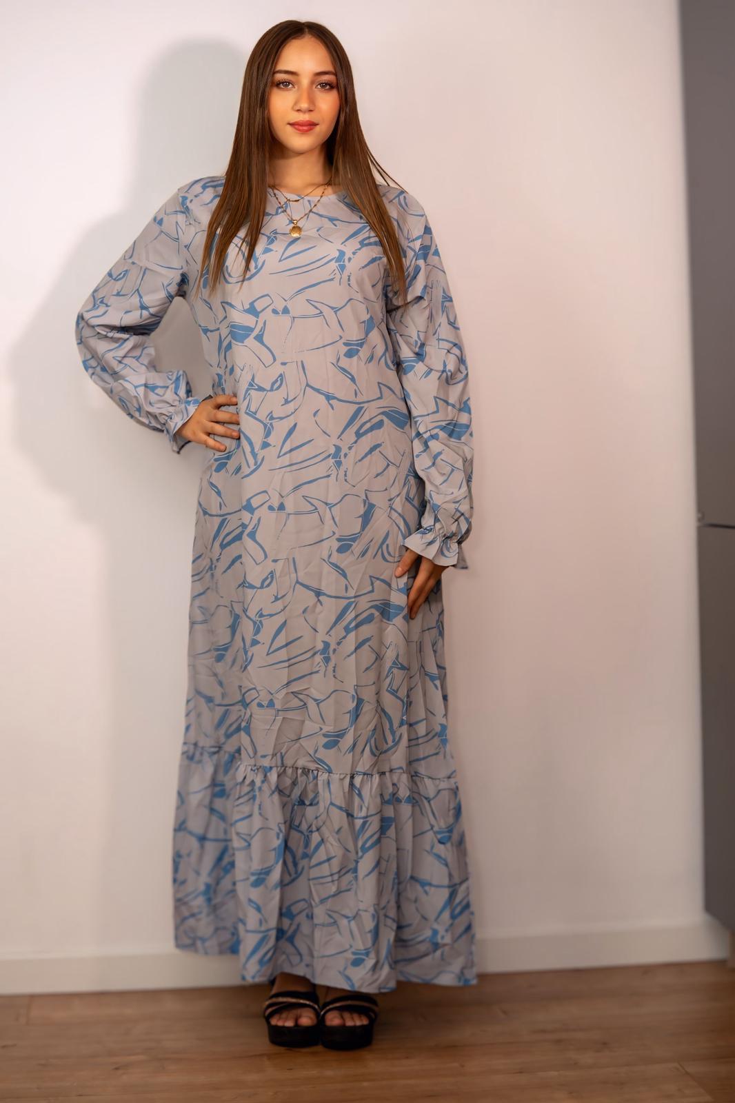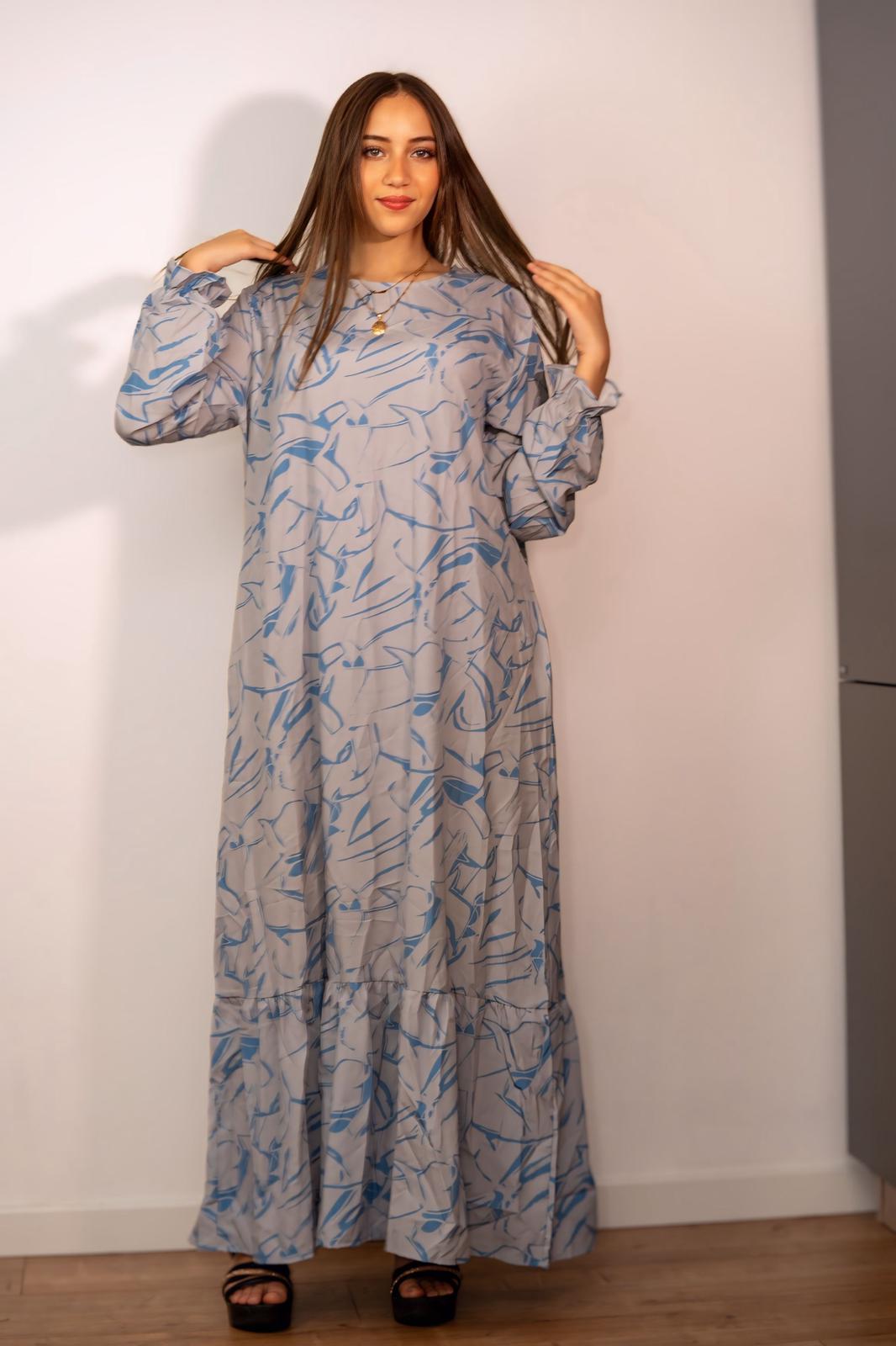 Questo vestito lungo, dal colore nero con qualche spunto di azzurro, è l’ideale per chi cerca uno stile modesto ma moderno.