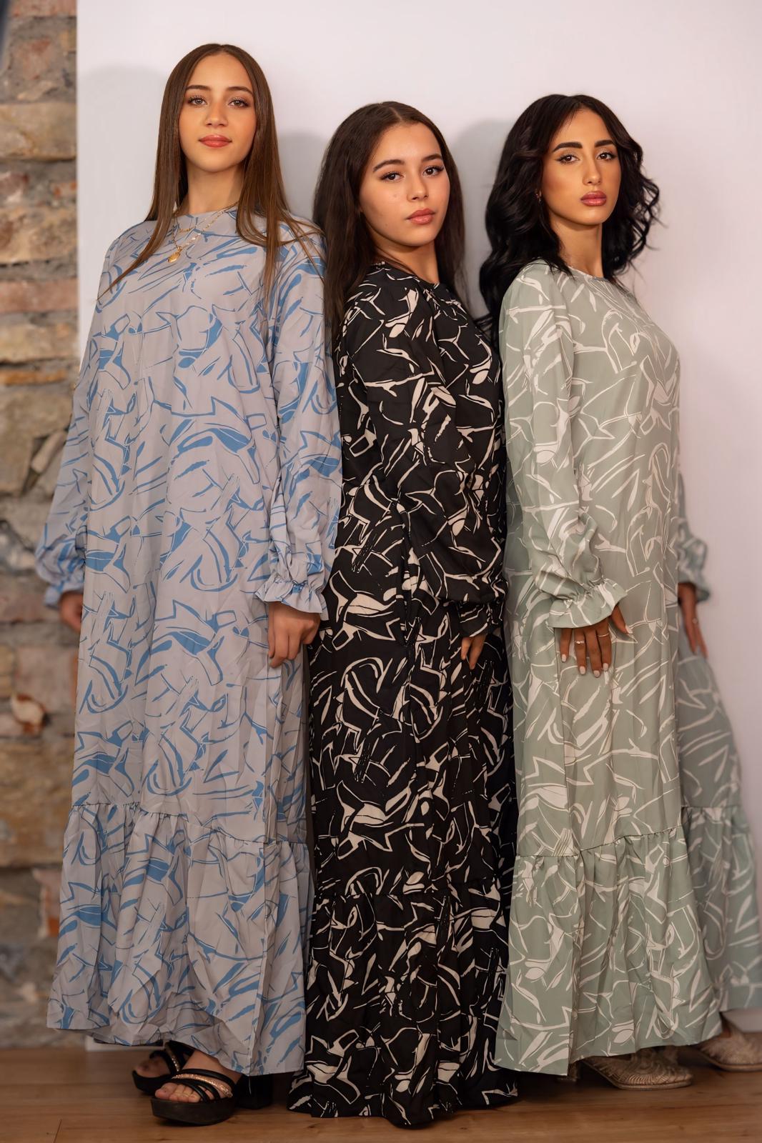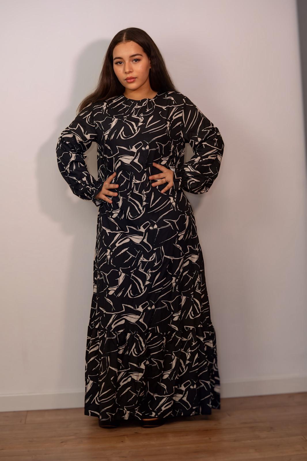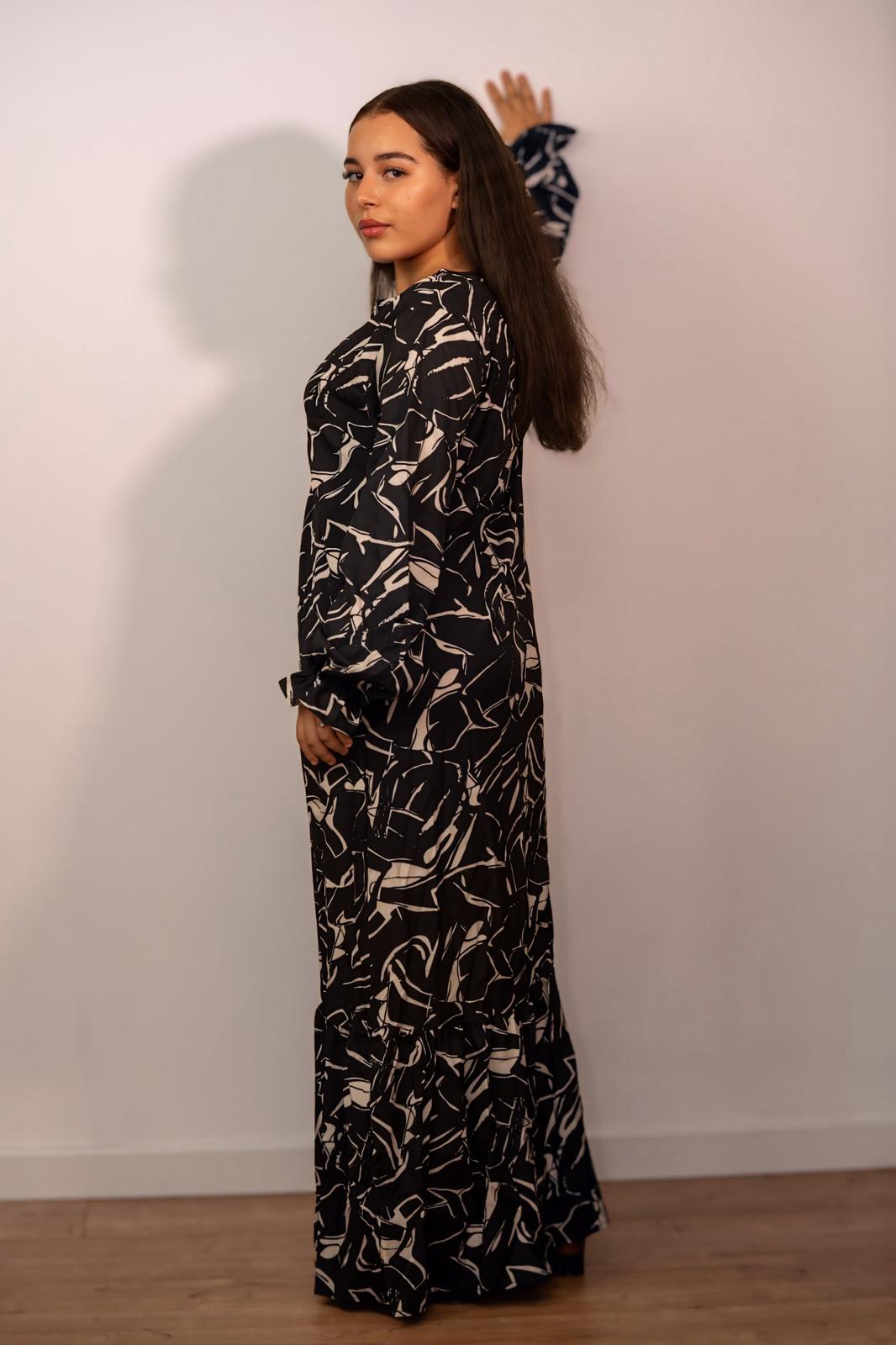 Questo vestito lungo, dal colore nero con qualche spunto di bianco, è l’ideale per chi cerca uno stile modesto ma moderno.